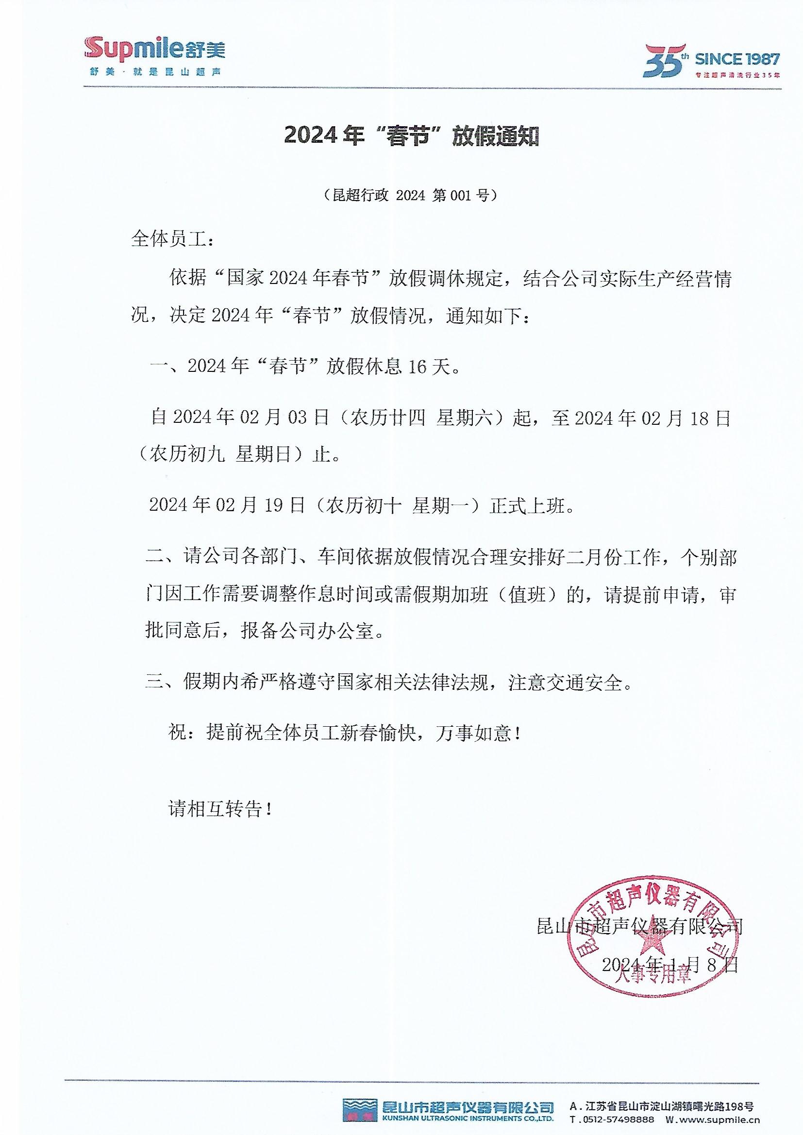 依據(jù)“國(guó)家2024年春節(jié)”放假調(diào)休規(guī)定,結(jié)合公司實(shí)際生產(chǎn)經(jīng)營(yíng)情況,決定2024年“春節(jié)”放假情況,通知如下: